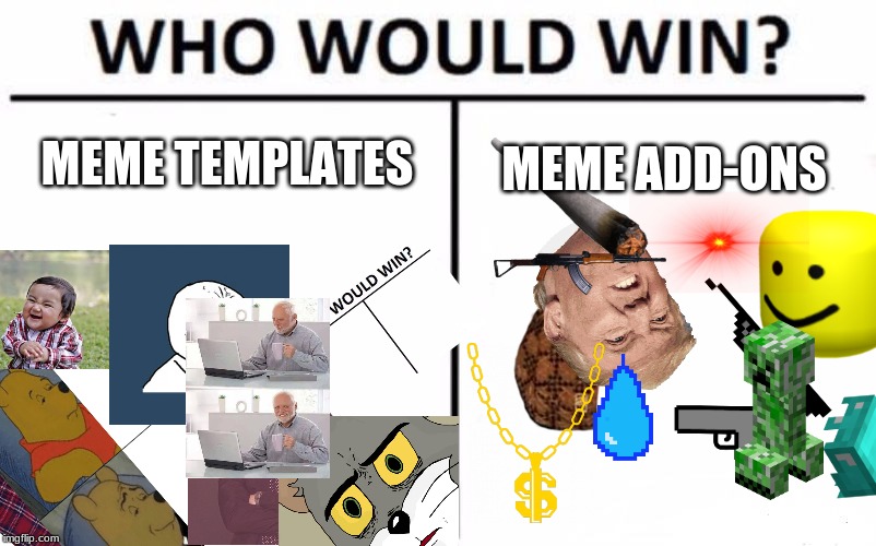 MOST FAMOUS MEMES OF ALL THE TIME!!!, Hey, like and subscribe, or the next intro will last 5 HOURS 👁️ 👃 👁️ TWITCH: lastterminatorfoxlt IG:@omarmahhadi . We Have got 5 pics about Who Would Win Meme Template images, photos, pictures, backgrounds, and more. In such page, we additionally have number of images out there. Such as png, jpg, animated gifs, pic art, symbol, blackandwhite, pics, etc. Daredevil 2x09 , Latest K-Drama and Anime News: https://bit.ly/3yWG4El.. "I Accidentally Became A Meme: Hide The Pain Harold", A stock photo shoot led to one of the biggest memes on the internet and changed one man's life forever. Click to subscribe to ..